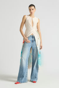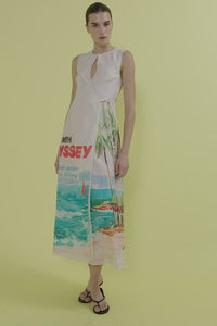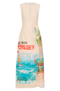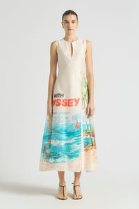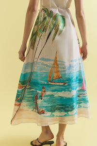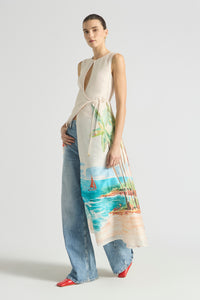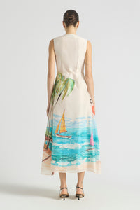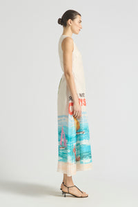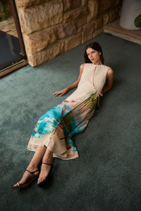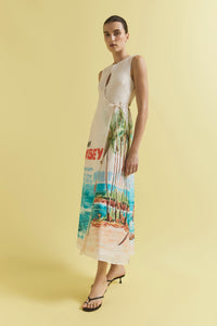 The Cruze Keyhole Cover Up evokes the ease of an endless summer. Featuring our original hand-painted Cruze print, it captures a nostalgic beach scene in washes of turquoise, coral, and sunlit sand. Crafted from a soft silk-cotton and fully lined for comfort, it features a slim bodice that flows into a voluminous skirt for graceful movement. The subtle keyhole neckline is finished with a gold hook and eye, complemented by a self-tie wrap detail for a flattering shape