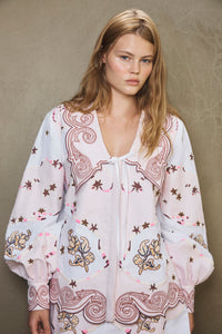 A romantic blouse with an effortless, airy feel, finished with delicate appliqué detailing and a softly scalloped hem. Light and fluid on the body, it pairs beautifully with the matching skirt for an elevated set, or styled simply for understated ease.