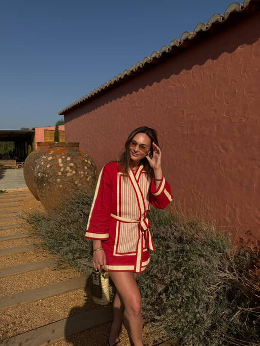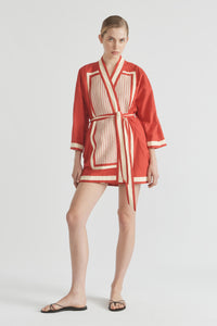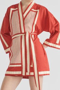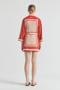 Our Bonita Robe is a work of art, harnessing boldness and textural dressing effortlessly. Carefully embroidered this truly luxurious look is completed by two side pockets and contrast bands. Wear closed as a dress or open and styled back with the retro inspired Bonita A-line short – our dream set.