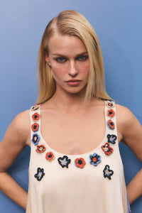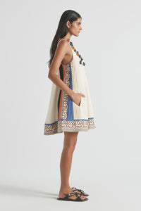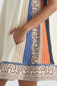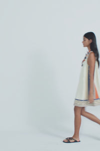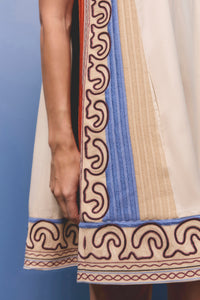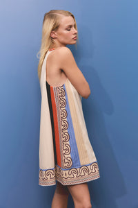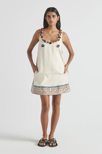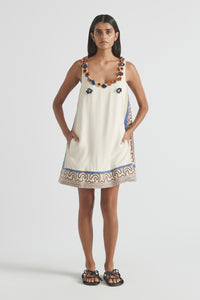 The Rise Scoop Neck Panel Mini is a chic and effortless piece made from soft cotton linen, featuring exclusive hand-drawn applique embroidery by our founder. With applique raffia borders and placement flowers, this sleeveless mini dress offers a relaxed fit and side seam pockets for convenience. Perfect for casual outings, pair it with flats for a day in the sun or dress it up with heels for evening plans.